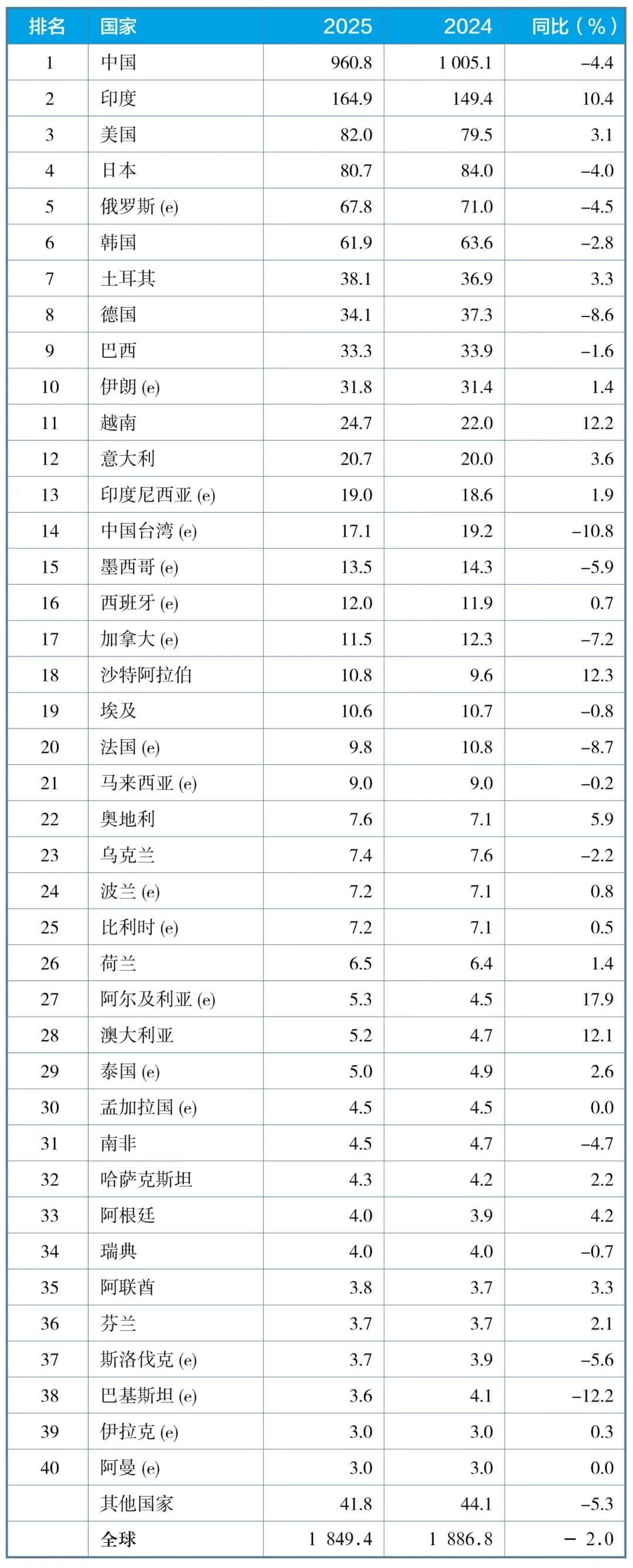2025年全年全球粗鋼產(chǎn)量為18.494億噸。查詢各主要產(chǎn)鋼國(guó)全年粗鋼產(chǎn)量的完整統(tǒng)計(jì)數(shù)據(jù),請(qǐng)登錄世界鋼鐵協(xié)會(huì)官網(wǎng)(Steel Data Viewer - worldsteel.org)或點(diǎn)擊文末“閱讀原文”。