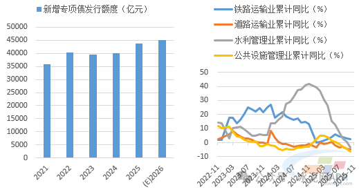 基建方面,我們判斷2026年投資將回正,基建端水泥需求將有改善?!笆逦濉币?guī)劃建議指出,加強(qiáng)謀劃論證,實(shí)施一批重大標(biāo)志性工程項(xiàng)目,高質(zhì)量推進(jìn)國(guó)家重大戰(zhàn)略實(shí)施和重點(diǎn)領(lǐng)域安全能力項(xiàng)目建設(shè)。2026年作為“十五五”開(kāi)局之年,預(yù)計(jì)專項(xiàng)債、超長(zhǎng)期特別國(guó)債發(fā)行規(guī)模將出現(xiàn)提高,基建投資將出現(xiàn)回正,但在化債政策影響下,水泥需求關(guān)系密切的交通類和市政基建投資或?qū)⒀永m(xù)低迷態(tài)勢(shì),預(yù)計(jì)基建整體對(duì)水泥需求支撐將有所改善,但力度可能仍然不強(qiáng)。