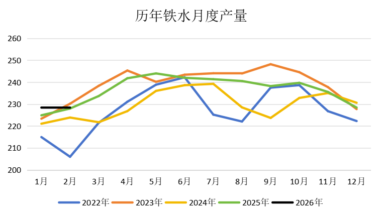 從歷年鐵水的數(shù)據(jù)來看,節(jié)后鋼企產(chǎn)量恢復(fù)速度較快,2026年初的鐵水產(chǎn)量處于歷史同期高位水平,且市場(chǎng)對(duì)未來需求持較大疑問,今年節(jié)后產(chǎn)量預(yù)計(jì)會(huì)逐漸恢復(fù),但恢復(fù)速度還有待觀察。