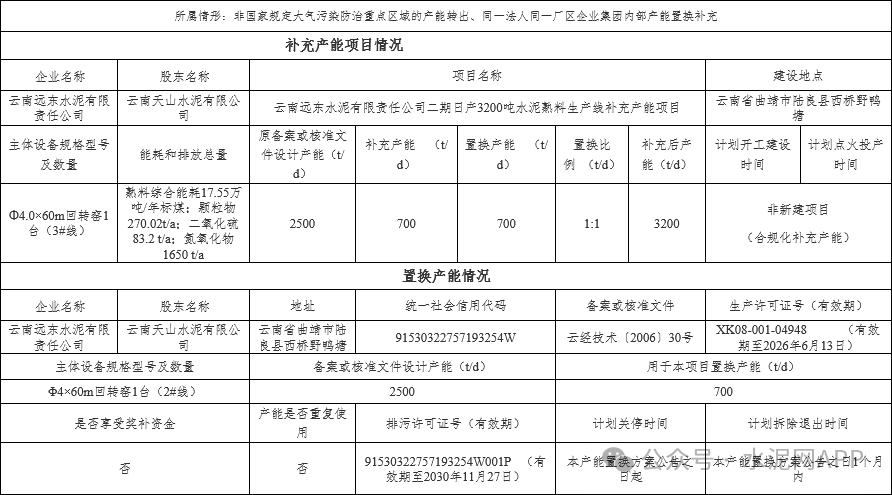 置換方案顯示,云南遠東水泥退出一條2500t/d熟料生產(chǎn)線,其中700t/d產(chǎn)能用于補充同廠區(qū)另一條2500t/d熟料線,補齊后產(chǎn)能為3200t/d,置換比例1:1。