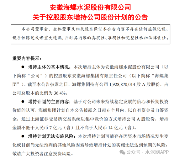 最高14億元!海螺水泥獲控股股東海螺集團(tuán)增持