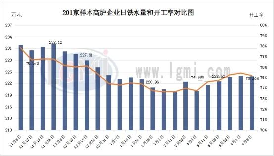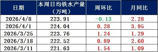 據(jù)調(diào)研,全國201家生產(chǎn)企業(yè)鐵水日均產(chǎn)量為223.91萬噸,較上周下降0.13萬噸;26年4月份日均鐵水產(chǎn)量為223.97萬噸,日均產(chǎn)量環(huán)比3月增加1.97萬噸。